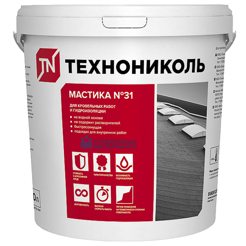 Мастика кровельная эмульсионная ТЕХНОНИКОЛЬ №31 - это готовый к применению материал, являющийся водной эмульсией нефтяного битума, модифицированного искусственным каучуком, технологических добавок и минеральных наполнителей. Покрытия на её основе обладают высокими: эластичностью, прочностью сцепления с основанием, теплостойкостью, устойчивостью к воздействию влаги. Не содержит растворителей.
