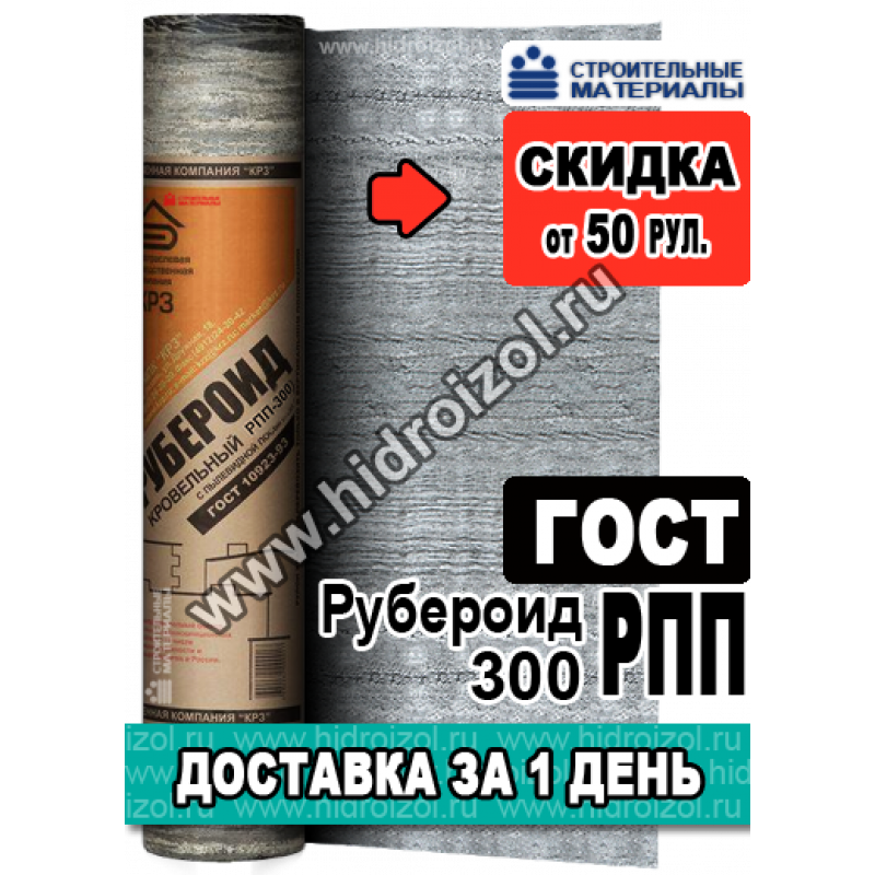 Рубероид РПП-300 ГОСТ полностью отвечает всем требованиям, которым должен соответствовать рубероид. В своем составе рубероид содержит картон весом 300 г/м2 и максимально толстую пропитку нефтяными битумами (с температурой размягчения первого слоя 37-50°С и свыше 80°С второго), что делает рубероид надежным гидроизоляционным материалом. Наличие тальковой посыпки на верхнем слое рубероида обеспечивает отсутствие склеивания материала при транспортировке и хранении.