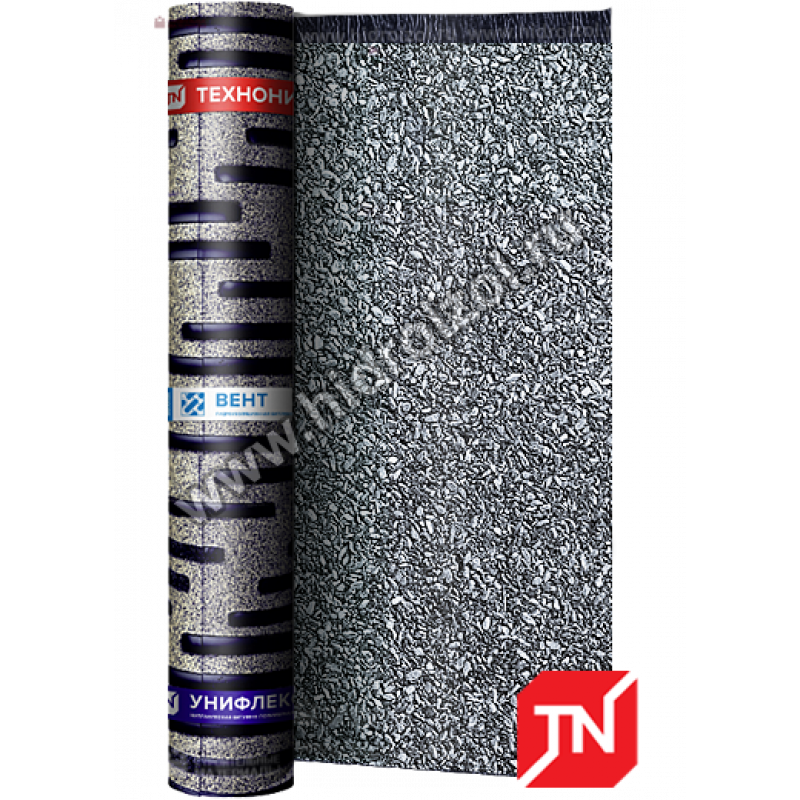 Унифлекс ВЕНТ получают путем двустороннего нанесения на полиэфирную основу битумно-полимерного вяжущего, состоящего из битума, бутадиенстирольного термоэластопласта и наполнителя. В качестве защитного слоя используют крупнозернистую (сланец), мелкозернистую (песок) посыпки сверху и вентилируемую поверхность снизу. Вентилируемая поверхность имеет полоски из битумно-полимерного вяжущего, пространство между которыми заполнено мелкофракционным песком и вся поверхность покрыта тонкой полимерной пленкой.