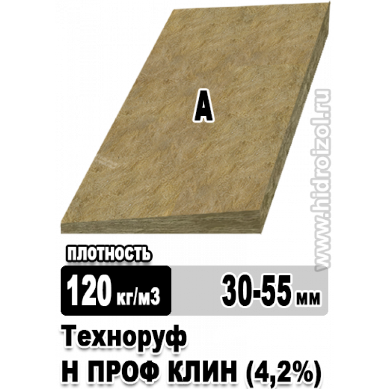 Плиты из каменной ваты для создания уклона на плоской кровле ТЕХНОРУФ Н ПРОФ КЛИН – негорючие, гидрофобизированные теплоизоляционные плиты, с предварительно созданным уклоном 4,2%, произведенные из минеральной ваты на основе горных пород базальтовой группы.При двухслойной системе теплоизоляции укладка осуществляется на первый (нижний) слой материала. Плотность 100-130 кг/м3. Прочность на сжатие не менее 30 кПа. Теплопроводность λ25°С: 0,038 Вт/м*К. Норма загрузки в фуру: 59,2416 м3.